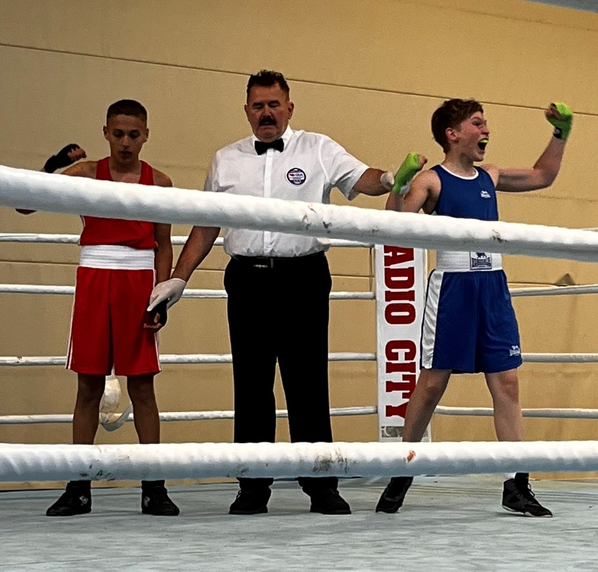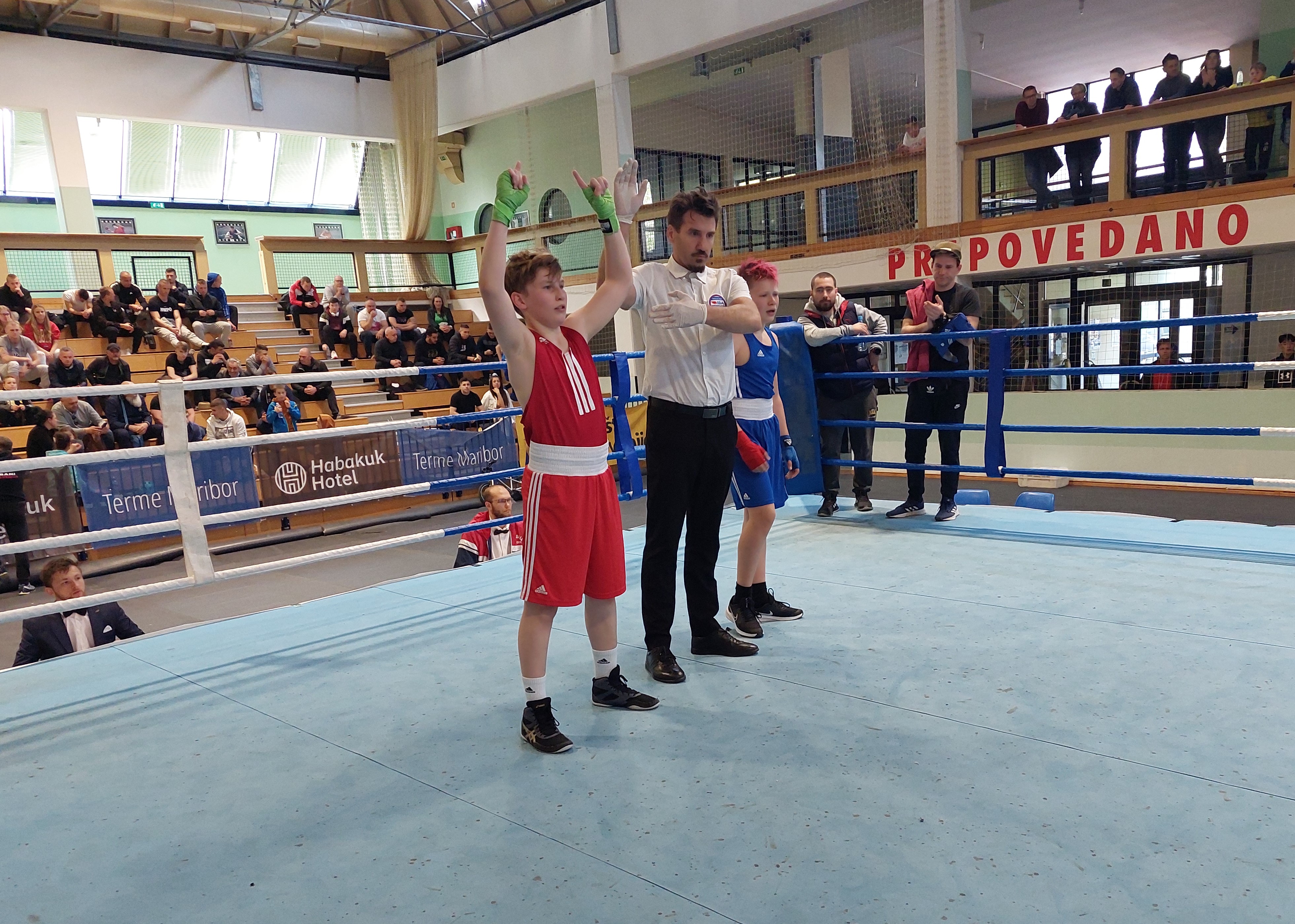Tudi tokrat je prvi v ring vstopil Miha Kralj (Schoolboys, -54kg). Pomeril se je z nasprotnikom s Ptuja, ki ga je v preteklosti že premagal. Ponovno je že na pričetku borbe pokazal po kaj je prišel. Vse tri runde je uspešno vršil pritisk na nasprotnika in precizno zadeval ter zasluženo slavil. Jutri ga čaka finale proti klubskemu kolegu.